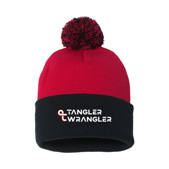 Tangler Wrangler Embroidered Sportsman Pom-Pom Beanie: Black and Red
